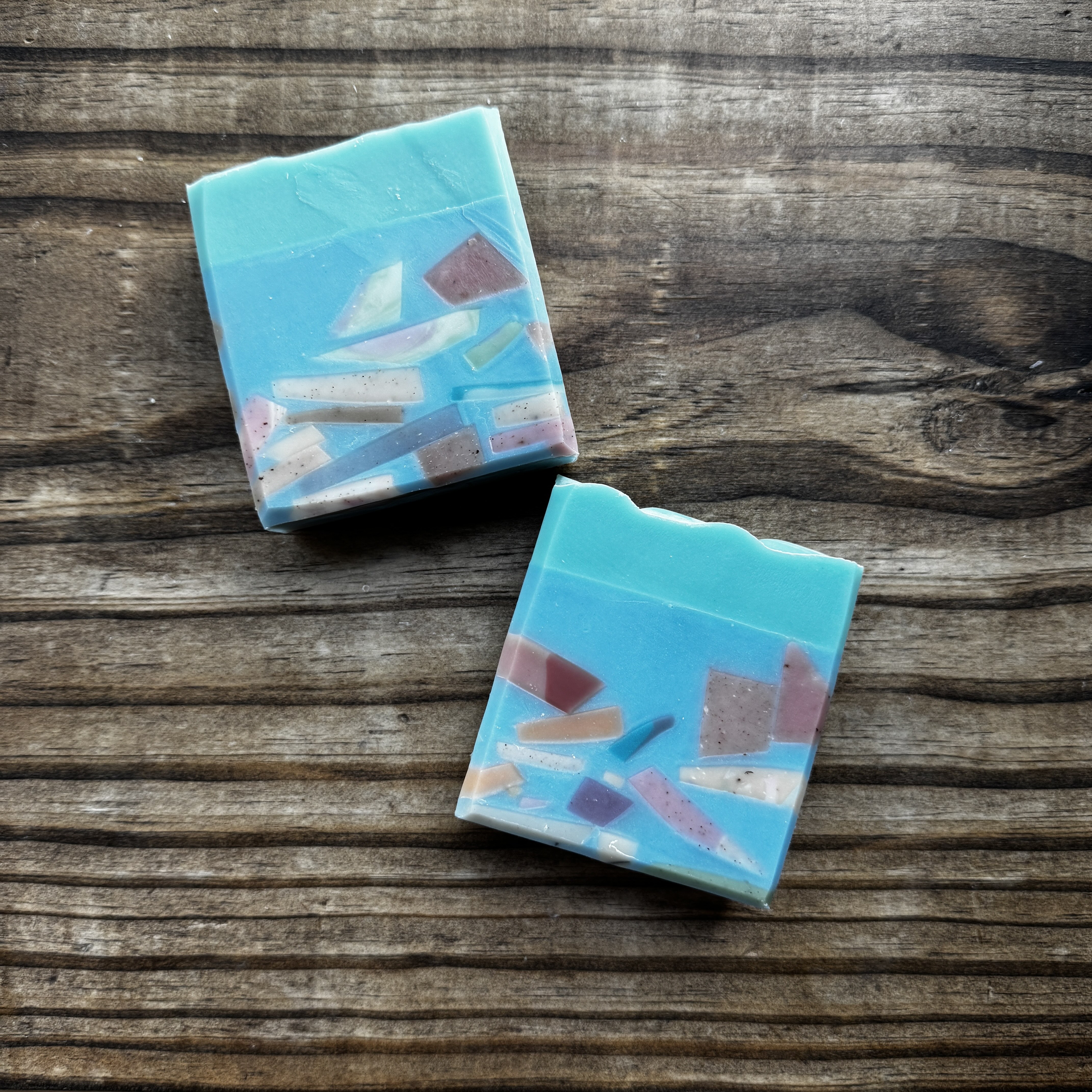 This is a minty fresh bar! Scent notes of rosemary, fresh garden herbs, and zesty mint. (Some of the the embeds of this bar are scrubby, but I wouldn't consider this a super scrubby bar!) Ingredients are coconut oil, olive oil, RSPO certified palm oil, sweet almond oil, castor oil, kaolin clay, walnut shells, and fragrance.